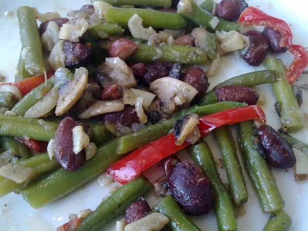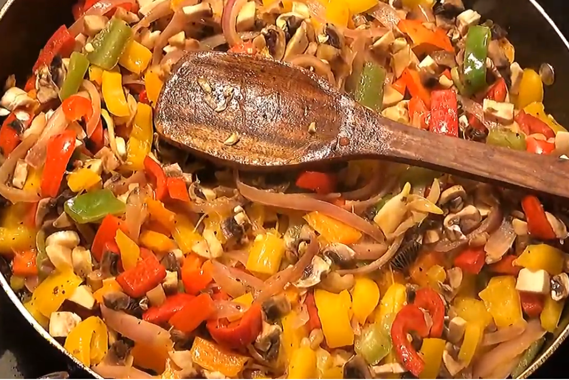Перец сладкий, шампиньоны, лук, томатный соус, сыр. Специи: перец черный молотый, перец красный острый молотый.